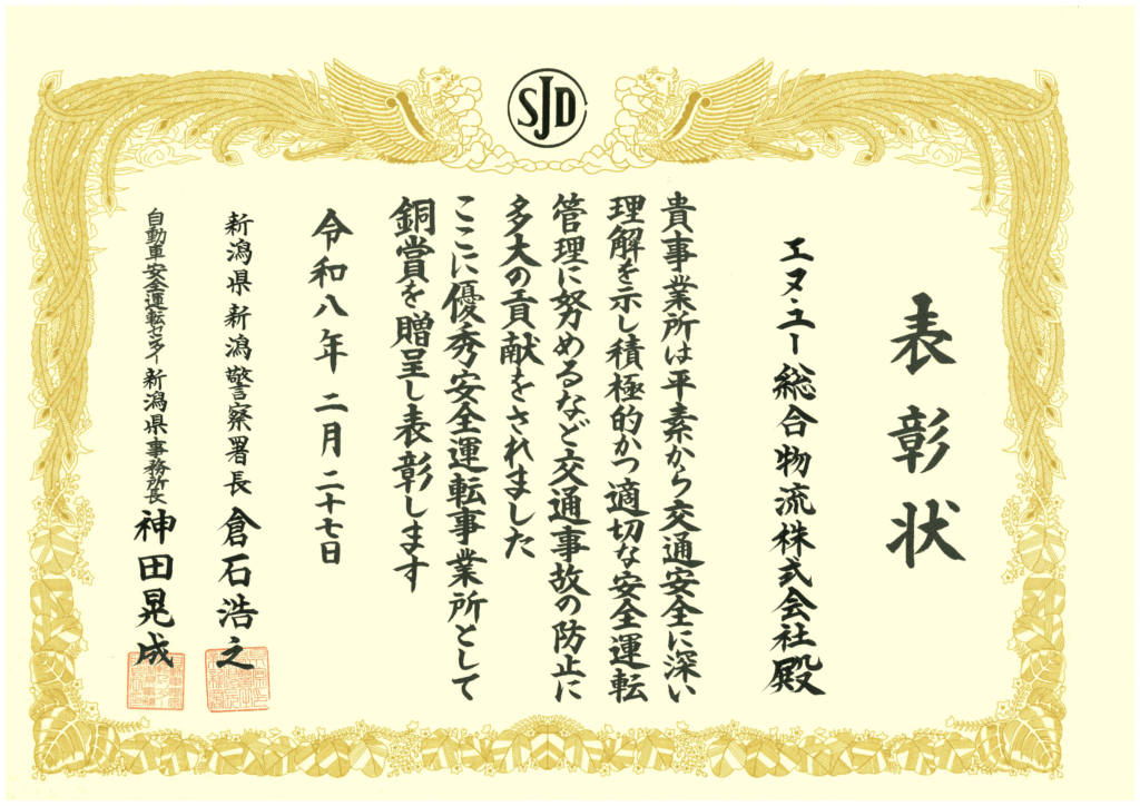 令和8年3月3日(火)新潟警察署と自動車安全運転センターより安全運転、交通事故防止への取り組みが評価され、銅賞を頂きました。社員一人ひとりが高い安全意識を持って業務に取り組んできた結果が形になったことを、大変うれしく思います。